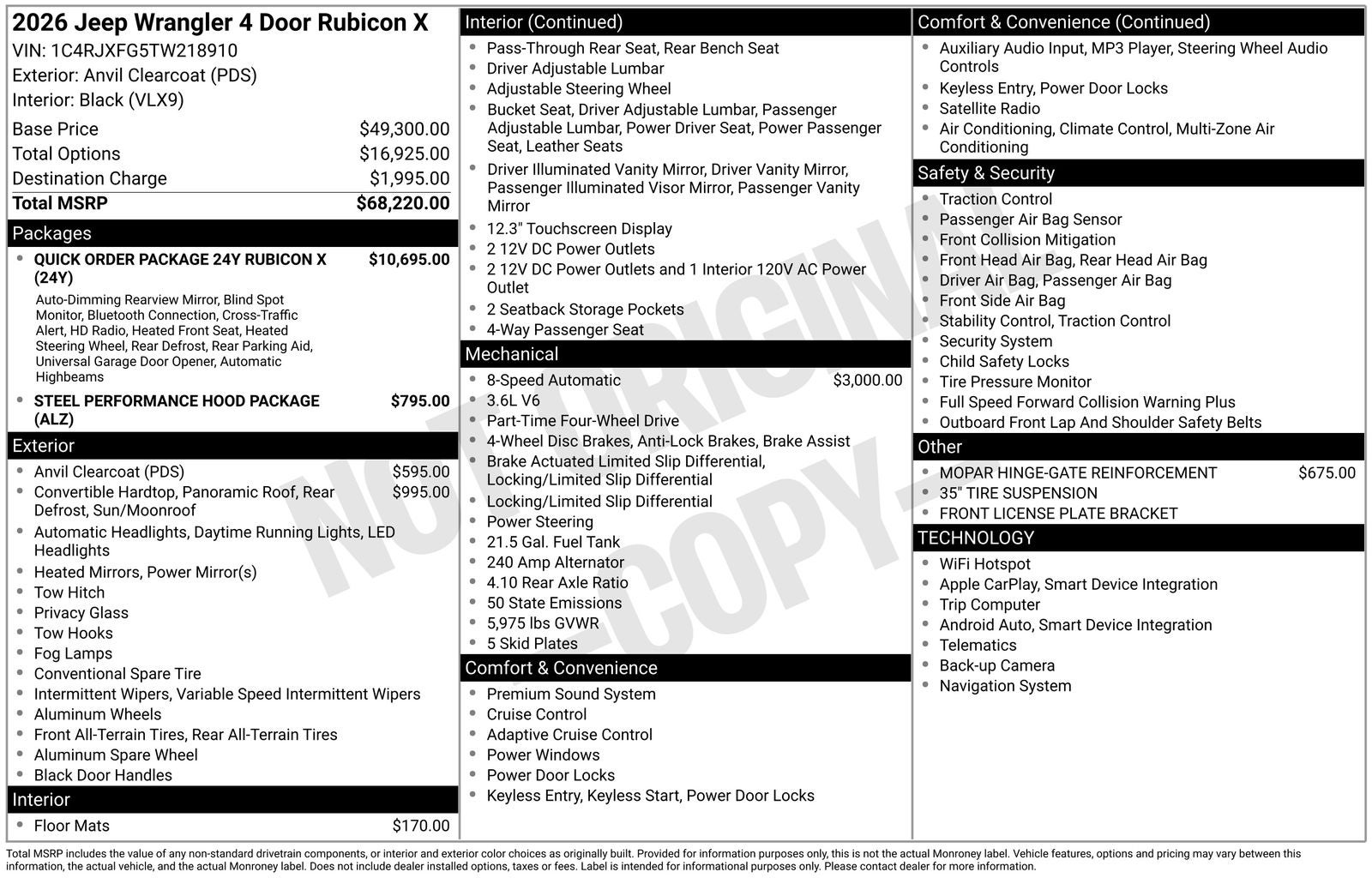 Anvil Clear Coat 2026 Jeep Wrangler Rubicon X 4WD 8-Speed Automatic 3.6L V6 24V VVT **DRIVE A LITTLE...SAVE A LOT**. Price includes: $1000 - 2026 National Retail Bonus Cash . Exp. 04/30/2026
