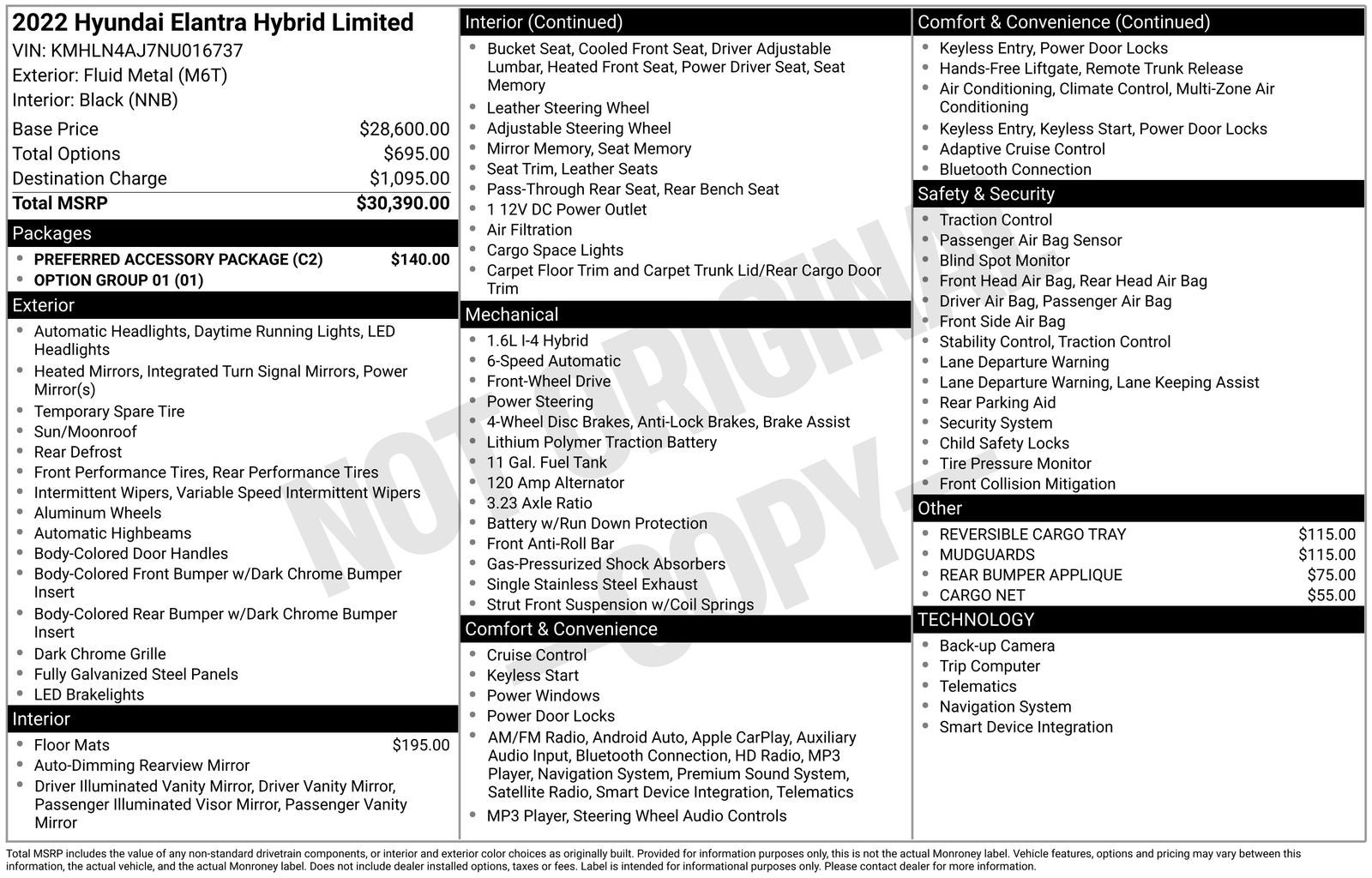 CARFAX One-Owner. 1.6L I4 DGI Hybrid DOHC 16V, 17 x 7.0J Alloy Wheels, Apple CarPlay & Android Auto, Auto-dimming Rear-View mirror, Automatic temperature control, Cargo Hook, Cargo Side Bins, Electronic Stability Control, Exterior Parking Camera Rear, First Aid Kit, Fully automatic headlights, Heated & Ventilated Front Bucket Seats, Heated front seats, Leather-Trimmed Seating Surfaces, Memory seat, Navigation System, Power moonroof, Preferred Accessory Package, Remote keyless entry, Security system, Speed control, Steering wheel mounted audio controls, Tachometer, Telescoping steering wheel, Tilt steering wheel.