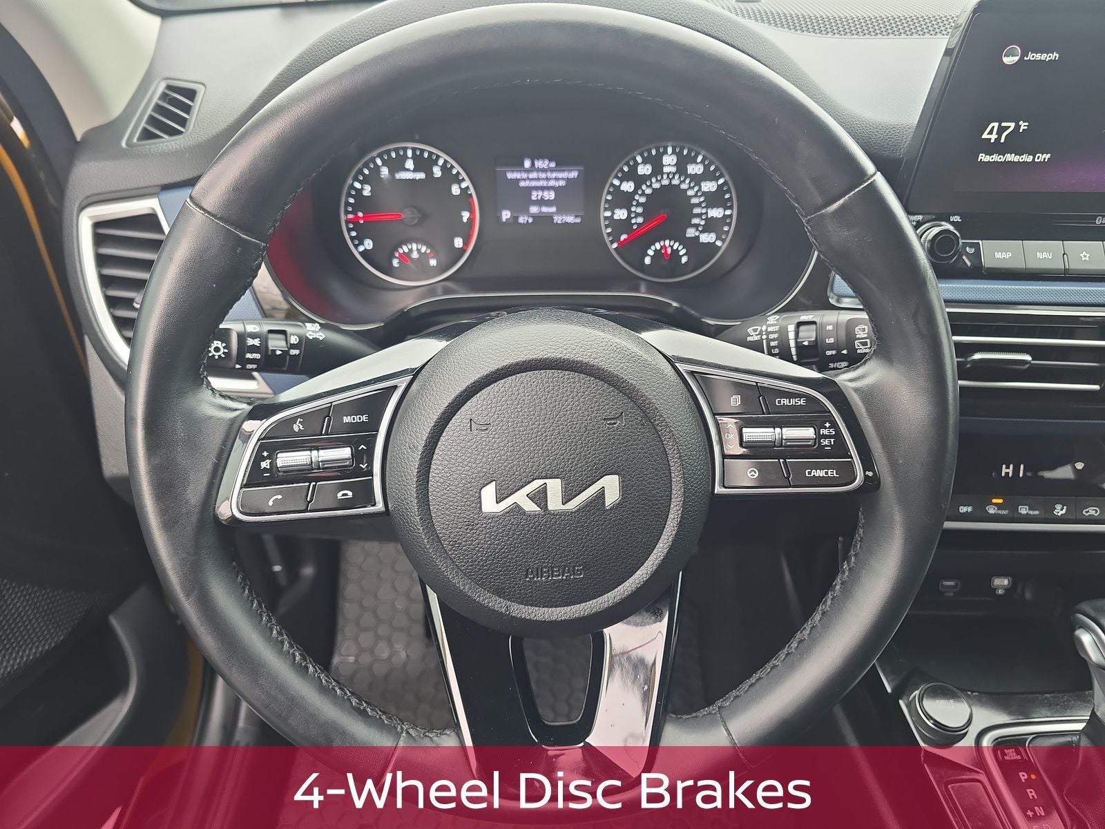 Clean CARFAX. This 2022 Kia Seltos S offers great style, efficiency, and value. It features a responsive 2.0L engine, a 10.25′′ touchscreen with Apple CarPlay/Android Auto, remote start, and advanced safety tech like Forward Collision Avoidance and Lane Keeping Assist. With roomy cargo space and excellent fuel economy, it’s a perfect daily driver or weekend adventurer., Starbright Yellow/Black Roof (GA7), 4-Wheel Disc Brakes, 6 Speakers, Air Conditioning, Apple CarPlay & Android Auto, Cargo Mat, Cargo Tray, Electronic Stability Control, Exterior Parking Camera Rear, Front fog lights, Fully automatic headlights, Glossy Black Door Garnish, Glossy Black Door Garnish Package, Navigation System, Radio: AM/FM/MP3 Display Audio w/Navigation, Remote keyless entry, Security system, Speed control, Speed-sensing steering, Steering wheel mounted audio controls, Tachometer, Telescoping steering wheel, Tilt steering wheel, Traction control, Turn signal indicator mirrors, Wheels: 17 Alloy w/Dark Gray Finish.