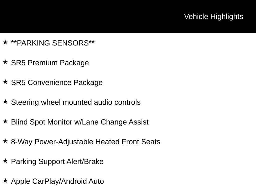 CARFAX One-Owner. SR5 **DRIVE A LITTLE...SAVE A LOT**, **Bluetooth®**, **HEATED SEATS**, **KEYLESS ENTRY**, **REAR VIEW CAMERA**, **BLIND SPOT MONITOR**, **KEYLESS IGNITION**, **LEATHER SEATS**, **PARKING SENSORS**, 4WD, Boulder Cloth, 8-Way Power-Adjustable Heated Front Seats, Apple CarPlay/Android Auto, Blind Spot Monitor w/Lane Change Assist, Parking Support Alert/Brake, SofTex Seat Trim, SR5 Convenience Package, SR5 Premium Package, Steering wheel mounted audio controls.