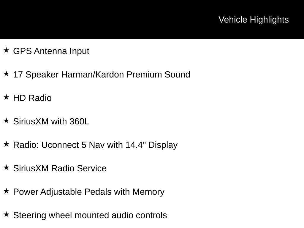 - Radio w/Seek-Scan, Clock, Speed Compensated Volume Control, Aux Audio Input Jack, Steering Wheel Controls, Voice Activation, Radio Data System and Uconnect External Memory Control